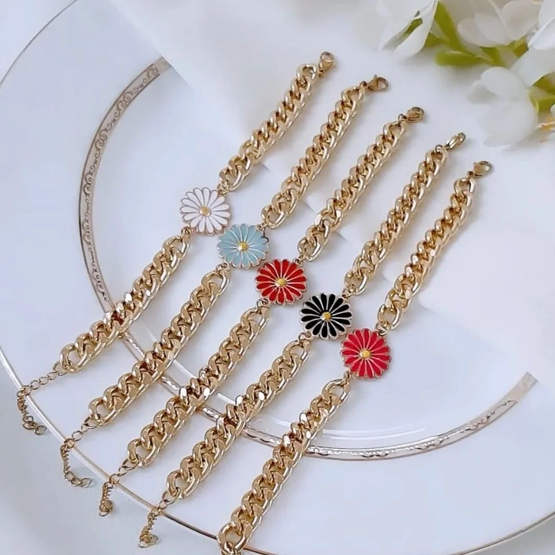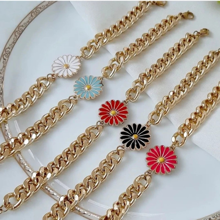 دستبند بابونه 🌟جنس زنجیر کار شده آلومینیومی رنگ ثابت میباشد 🌟دارای ۵ سانت زنجیر اضافی برای تنظیم سایز 🌟اندازه دستبند برای مچ دست ۱۶ الی ۲۰ سانت اگه بابونه های جذابمون رو دوست داشتی بفرست واسه دوست و آشناهات تا اونا هم این خوشگلا رو ببینند😘