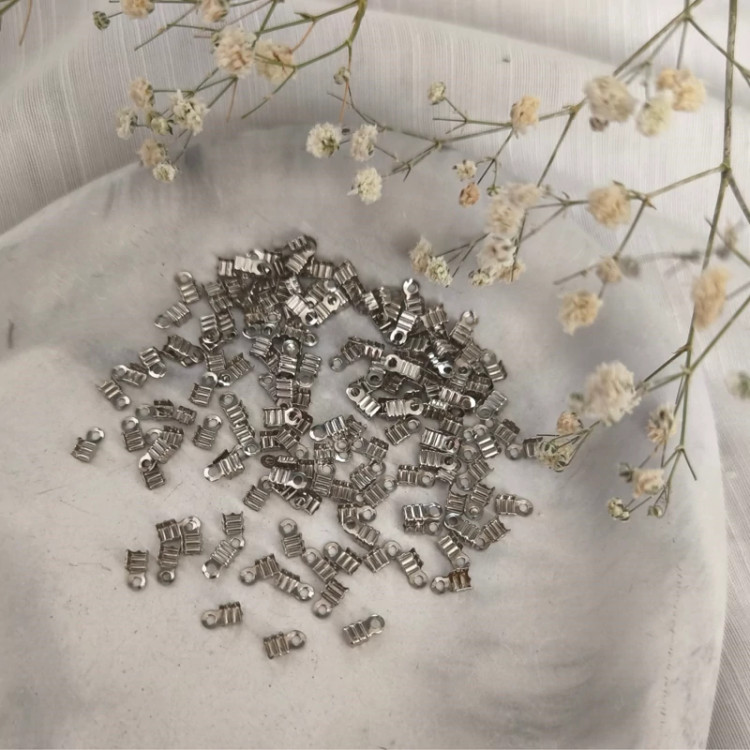 بست به رنگ نقره ای جهت حذف گره های نخ های استفاده شده در دستبند، بند عینک و گردن آویز کاربرد دارد. و در بسته های 5 گرمی عرضه می شود. تعداد داخل بسته مطابق تصویر رنگ ثابت نیست