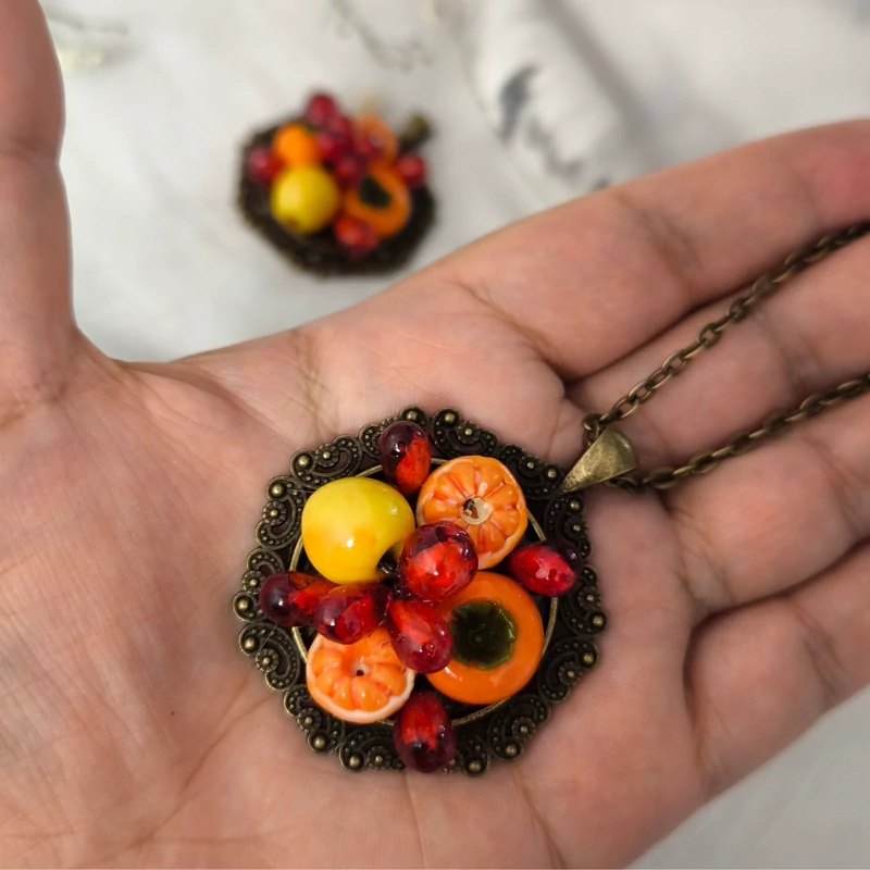 گردنبند یلدایی جنس میوه های کار شده نشکن و رنگ ثابتن متریال کار شده به رنگ برنزی میباشد اندازه زنجیر گردنبند 60 سانت میباشد رنگ ثابته