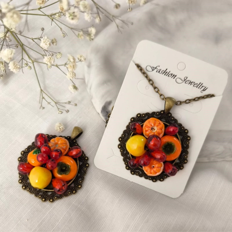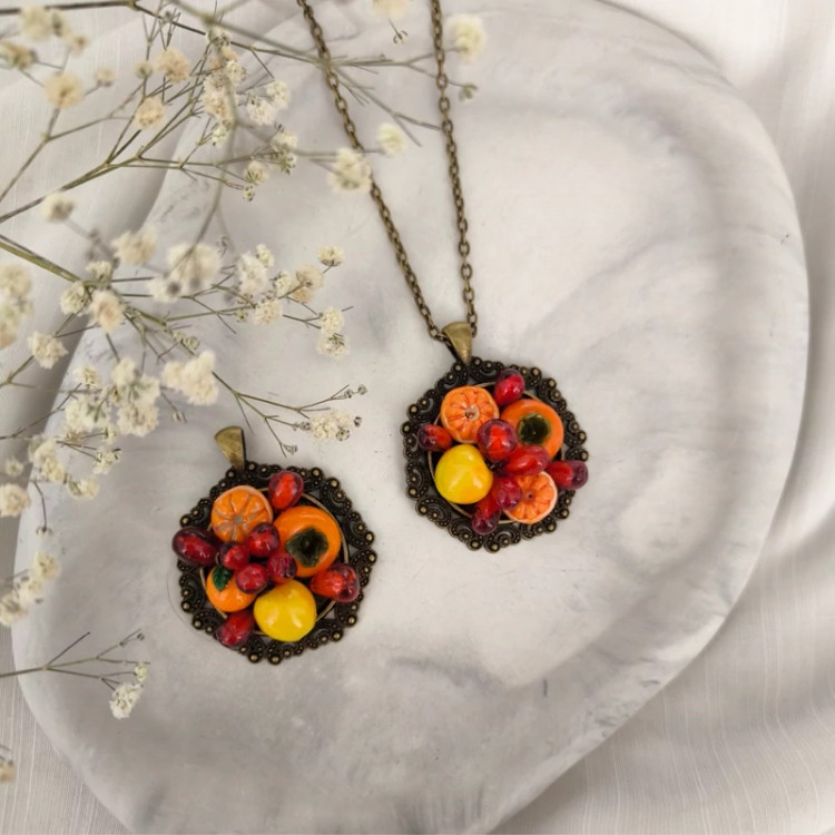 گردنبند یلدایی جنس میوه های کار شده نشکن و رنگ ثابتن متریال کار شده به رنگ برنزی میباشد اندازه زنجیر گردنبند 60 سانت میباشد رنگ ثابته