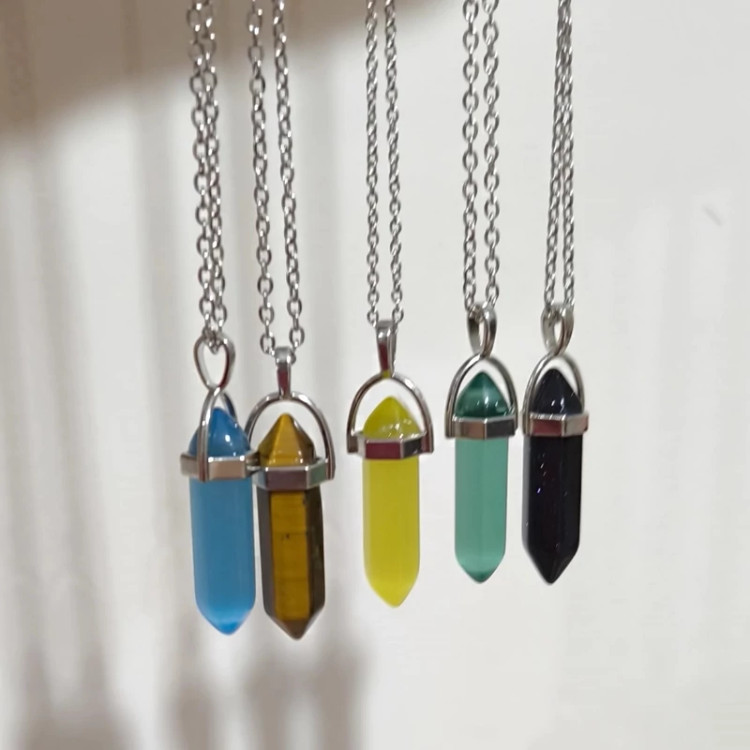 رنگ زرد،ابی،سبز سنگ چشم گربه رنگ قهوه ای سنگ چشم ببر رنگ سرمه ای سنگ دلربا زنجیر گردنبند ها 45 سانت جنس منشور ها سنگ اصل میباشد زنجیر کار شده رنگ ثابت میباشد